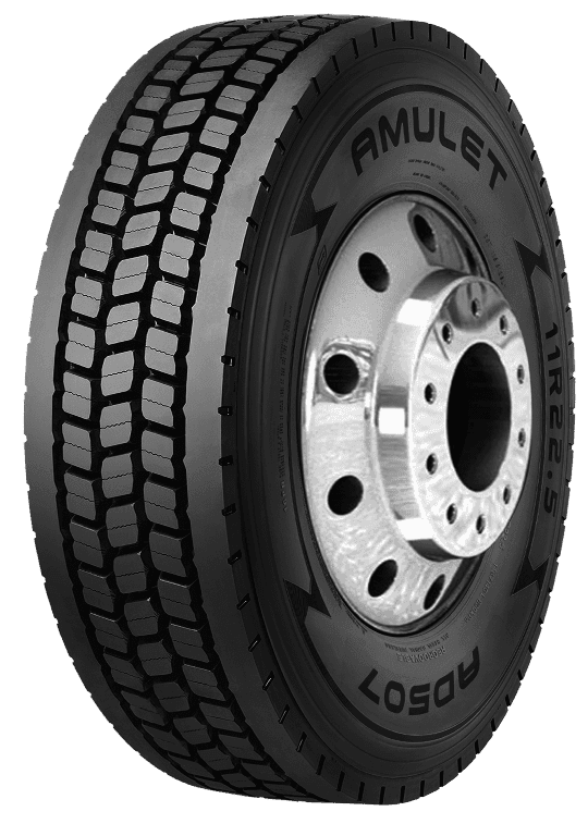 Amulet's AD507 is a commercial tire that's designed for use on the drive axle of trucks in long haul applications. Tie-bars within the tread work with closed shoulders to fend off uneven wear and promote a longer tread life, and the AD507's large footprint and angled tread blocks put more rubber on the road to enhance traction and stability.