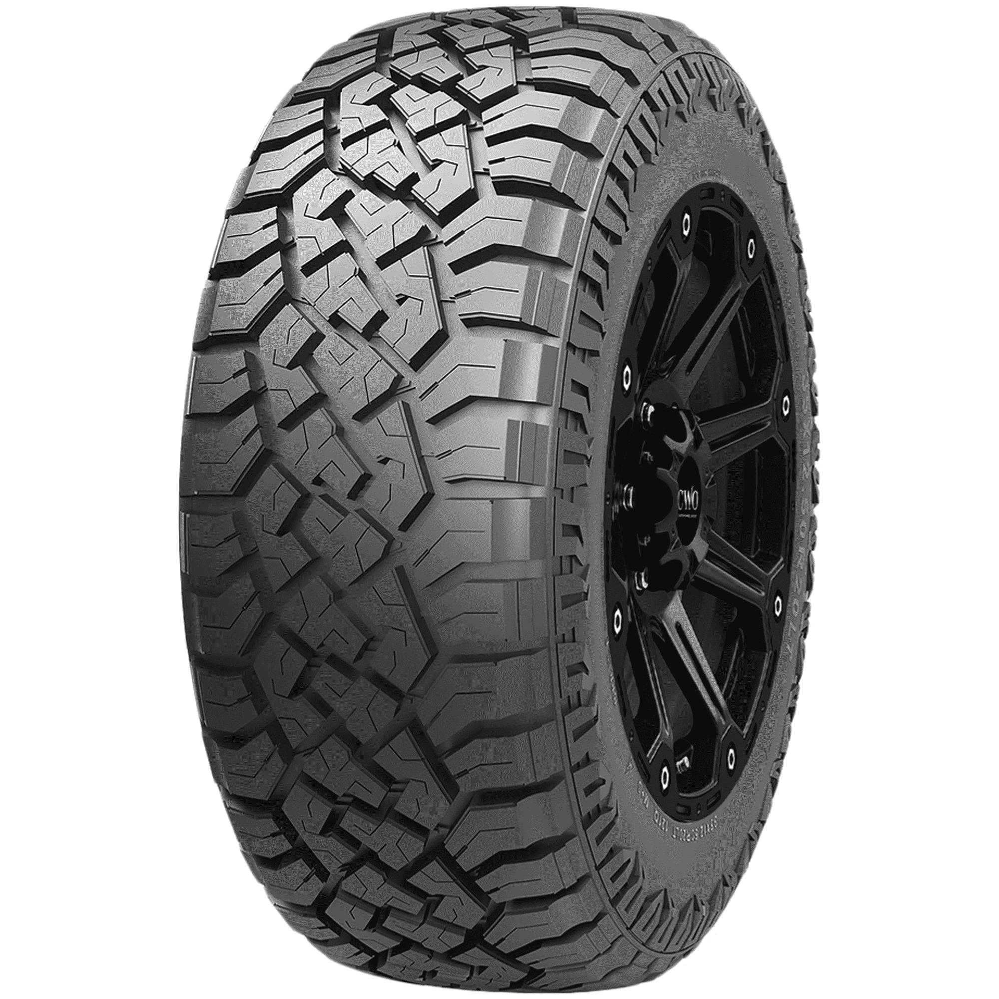 Tough and tenacious, the Dcenti DC44 RT is a rugged-terrain tire for light trucks that features an aggressive lug tread pattern, damage-resistant rubber compound, rugged construction, and reinforced sidewalls for rough off-road use.